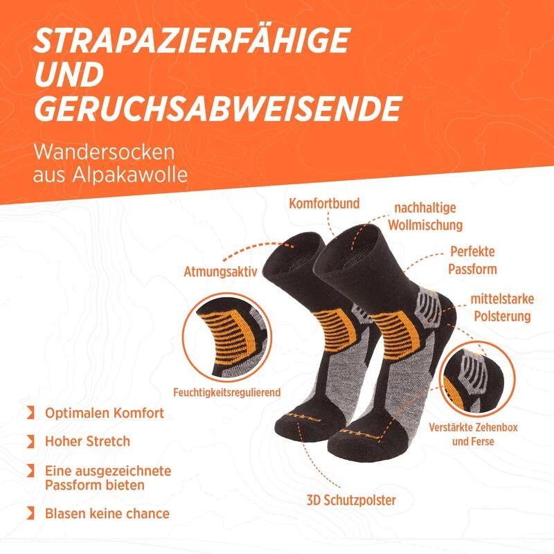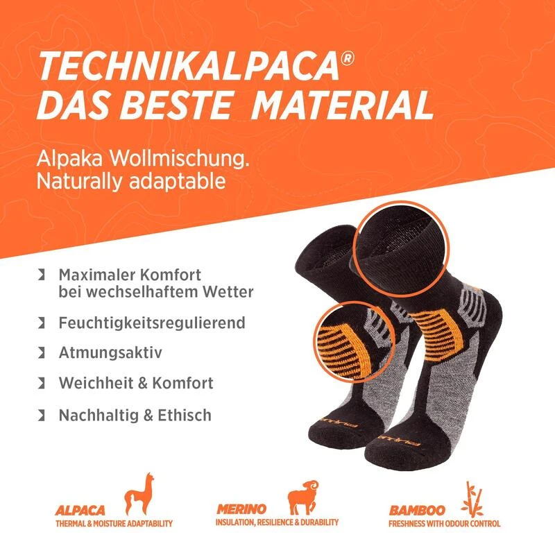 De CAMINO-sokken, gebreid uit een speciaal mengsel van natuurlijke vezels, passen zich aan aan warme en koude omstandigheden. Vocht wordt afgevoerd en geurtjes worden voorkomen. De CAMINO houden uw voeten droog en zijn zeer comfortabel om te dragen op elk moment. 50% baby alpaca 20% merinoswol 10% bamboe 11% nylon 6% elastaan 3% spandex