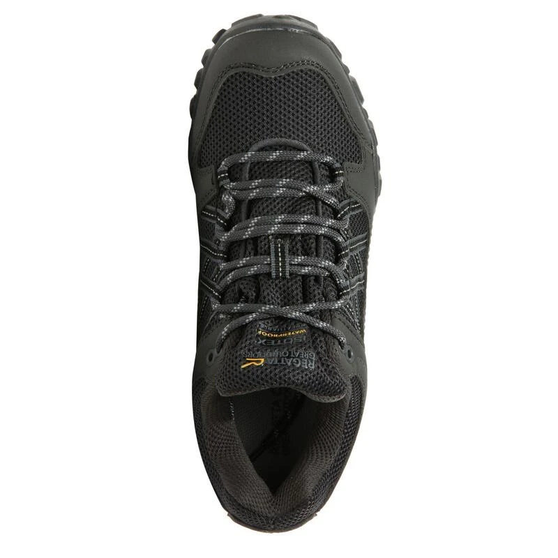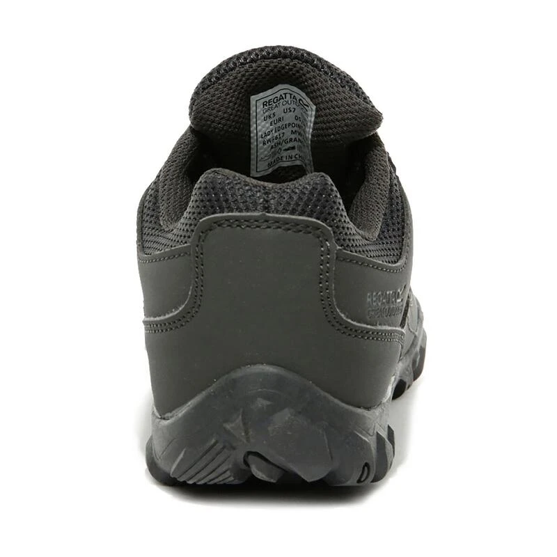 De Lady Edgepoint lage wandelschoen van Regatta is waterdicht en ademend dankzij de waterafstotende Hydropel-technologie en een waterdicht/ademend Isotex-membraan met getapete naden. De inzetstukken van rubber en de schokabsorberende EVA-kussentjes beschermen de voeten bij elke stap. Gewicht: 320 gram.